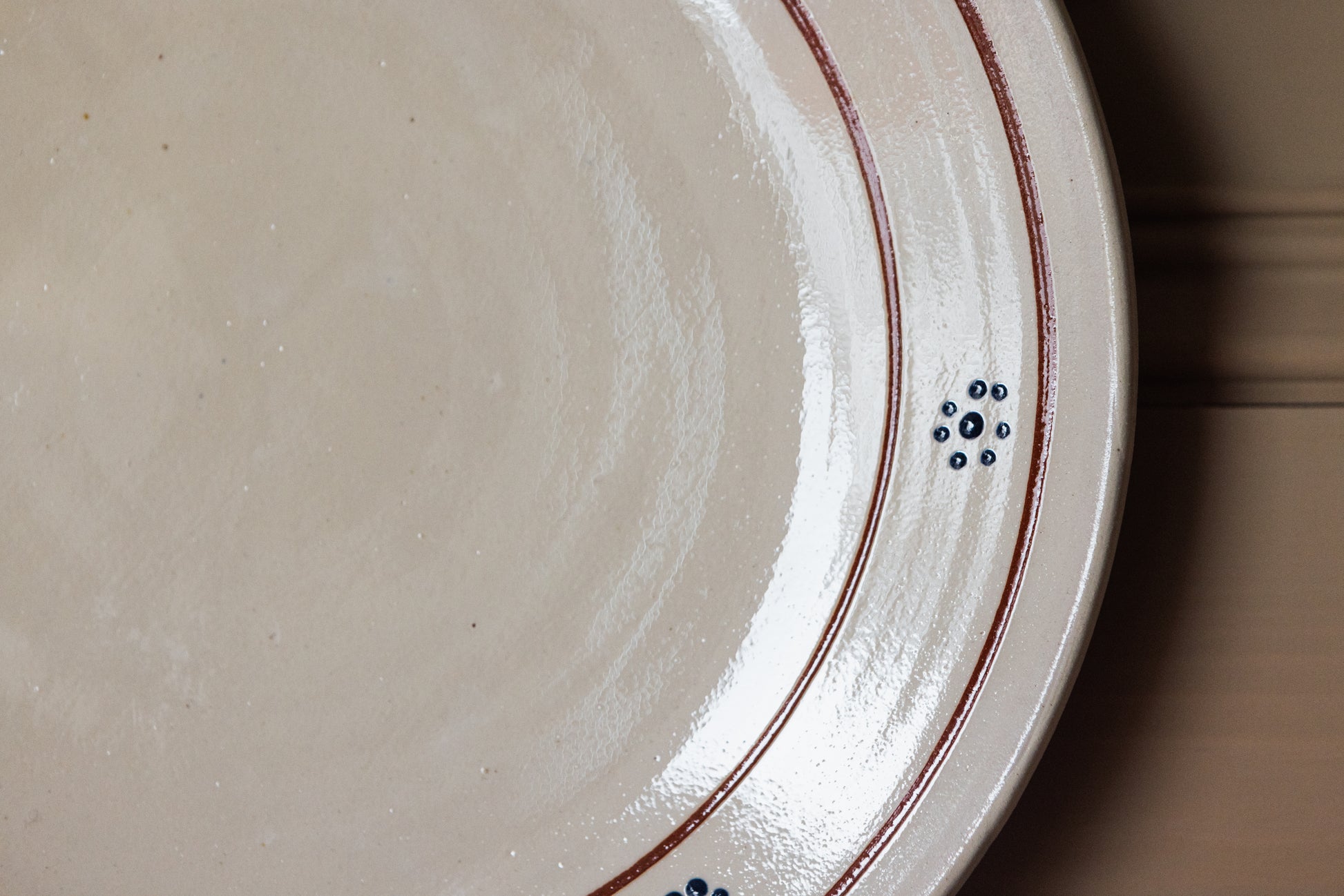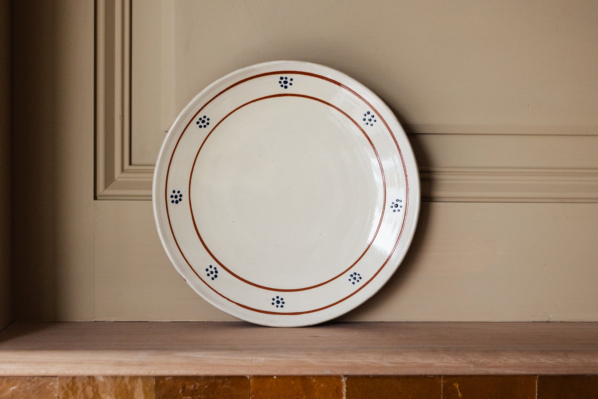 Designed by us, hand-spun and shaped in a light-filled studio in Spain, and then hand-painted with pretty Catalan flowers by local artists, our Margot Serving Plate paints the story of the local flora. The classic forget-me-not blue Spanish flowers form a motif around the edge of the plate, framed by hand drawn lines in a light terracotta brown. The traditional shape and generous size makes it perfect for passing around canapés, or serving brightly coloured crudités to allow the colours to sing.
